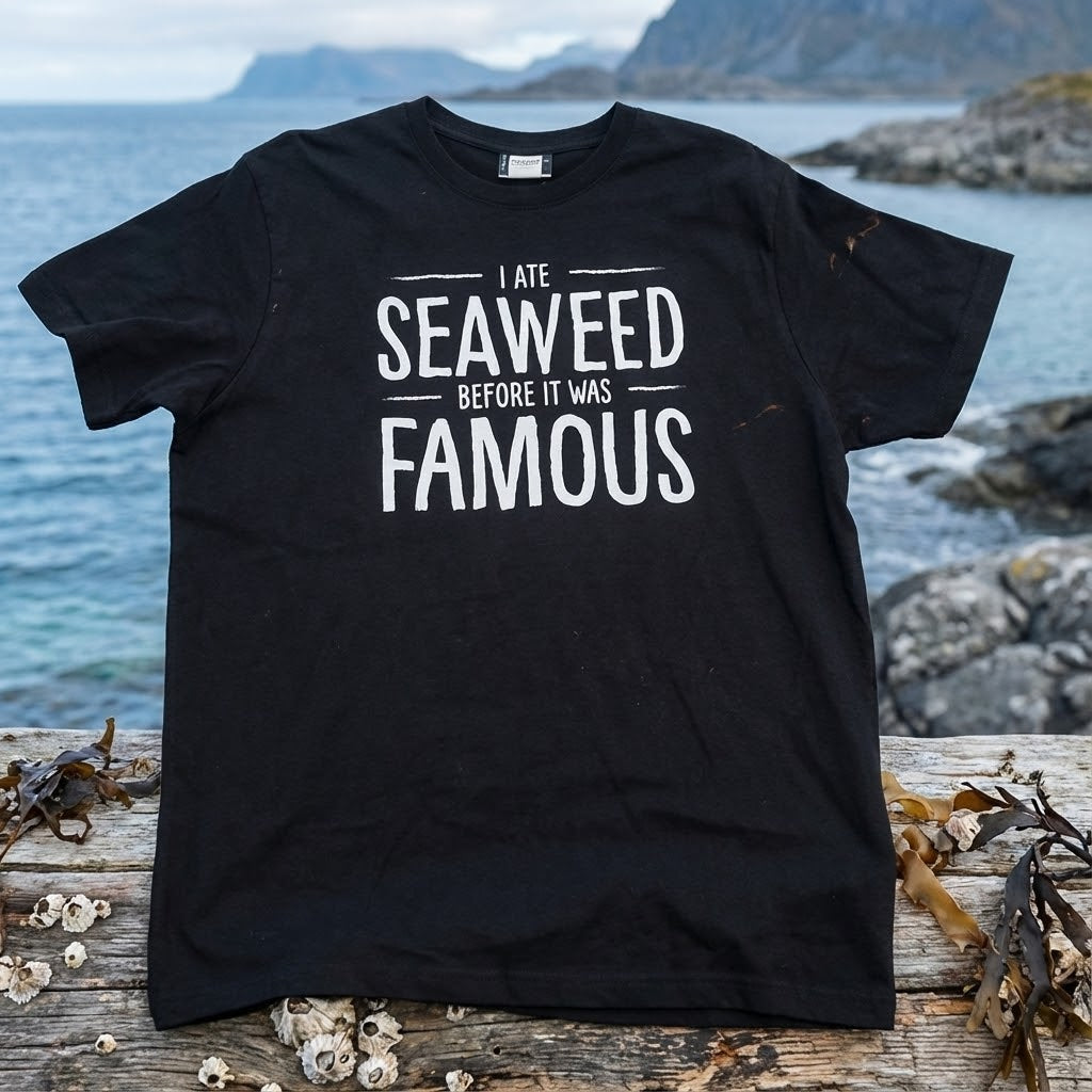 Kule t- skjorter med Sjøsaker logo på baksiden og "i ate seaweed before it was famous"